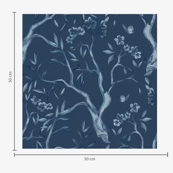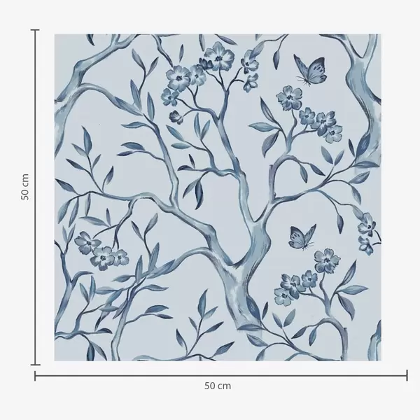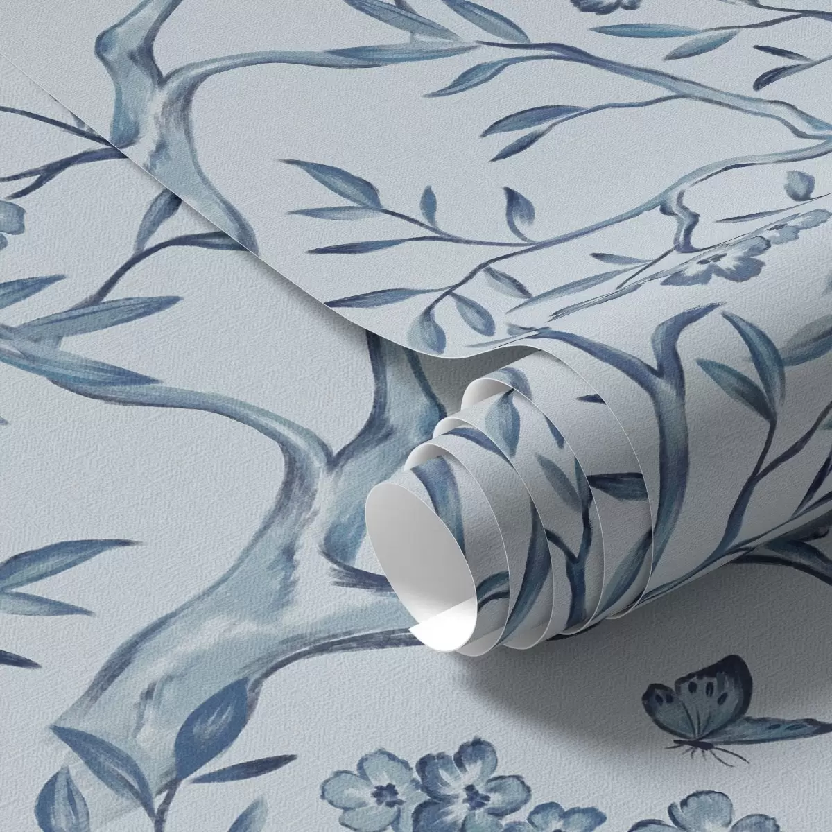 Papel pintado Ramas azules acuareladas con flores y mariposas sobre fondo claro. Nr. a00951