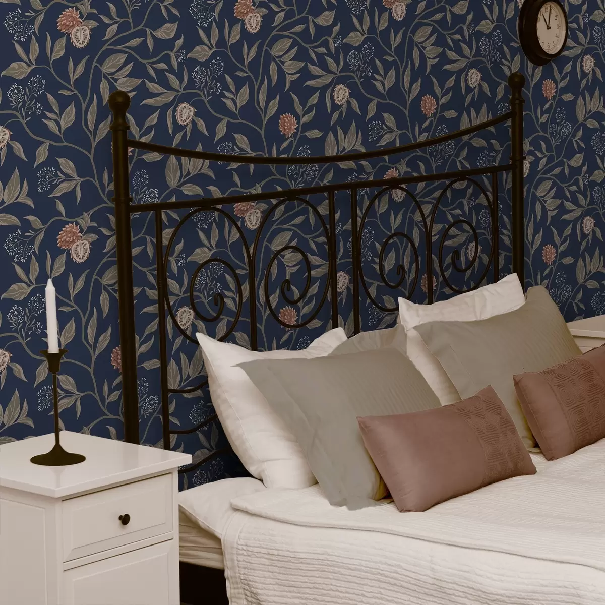 Papel pintado Jardín azul con ramas, frutos y pequeñas flores. Nr. a00959