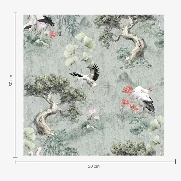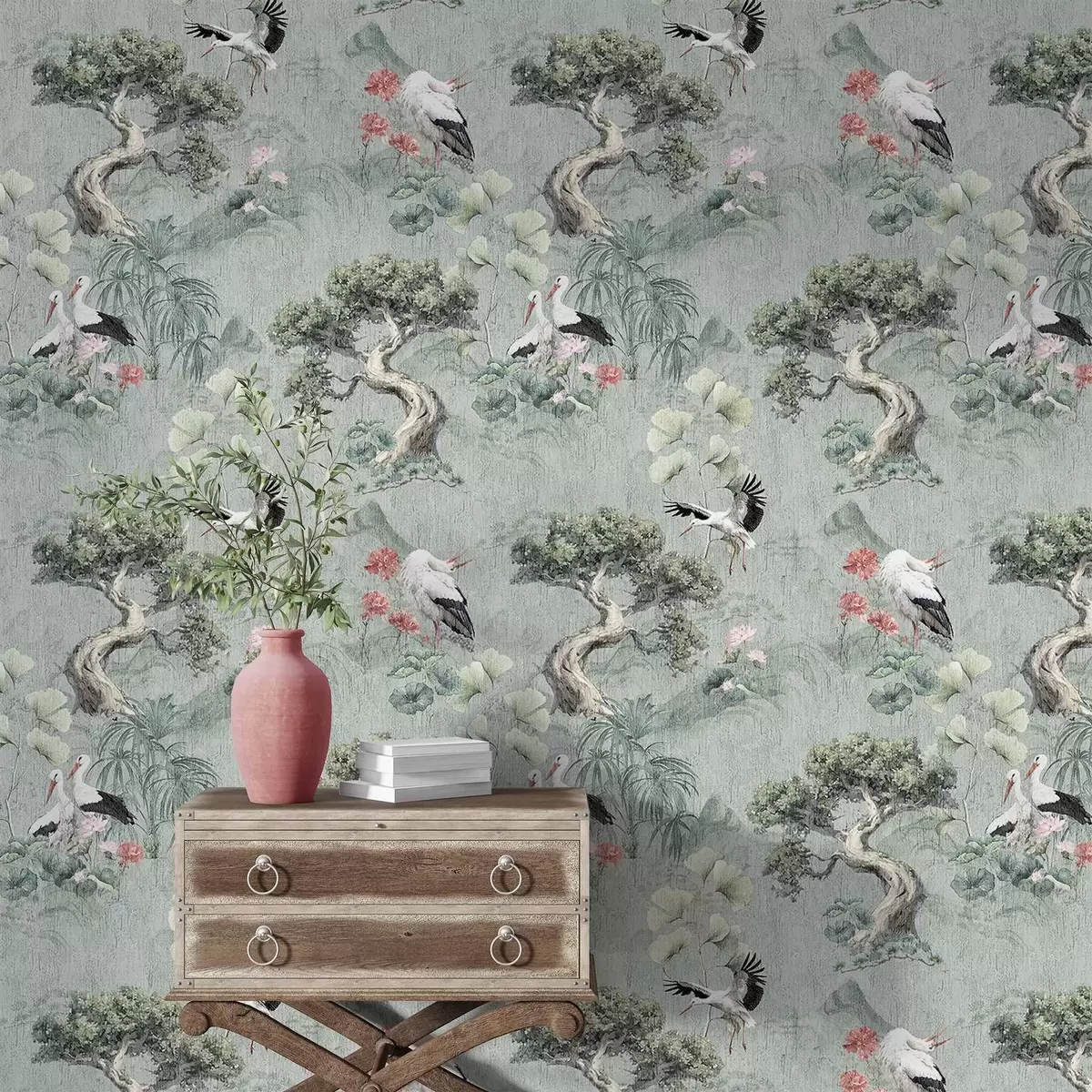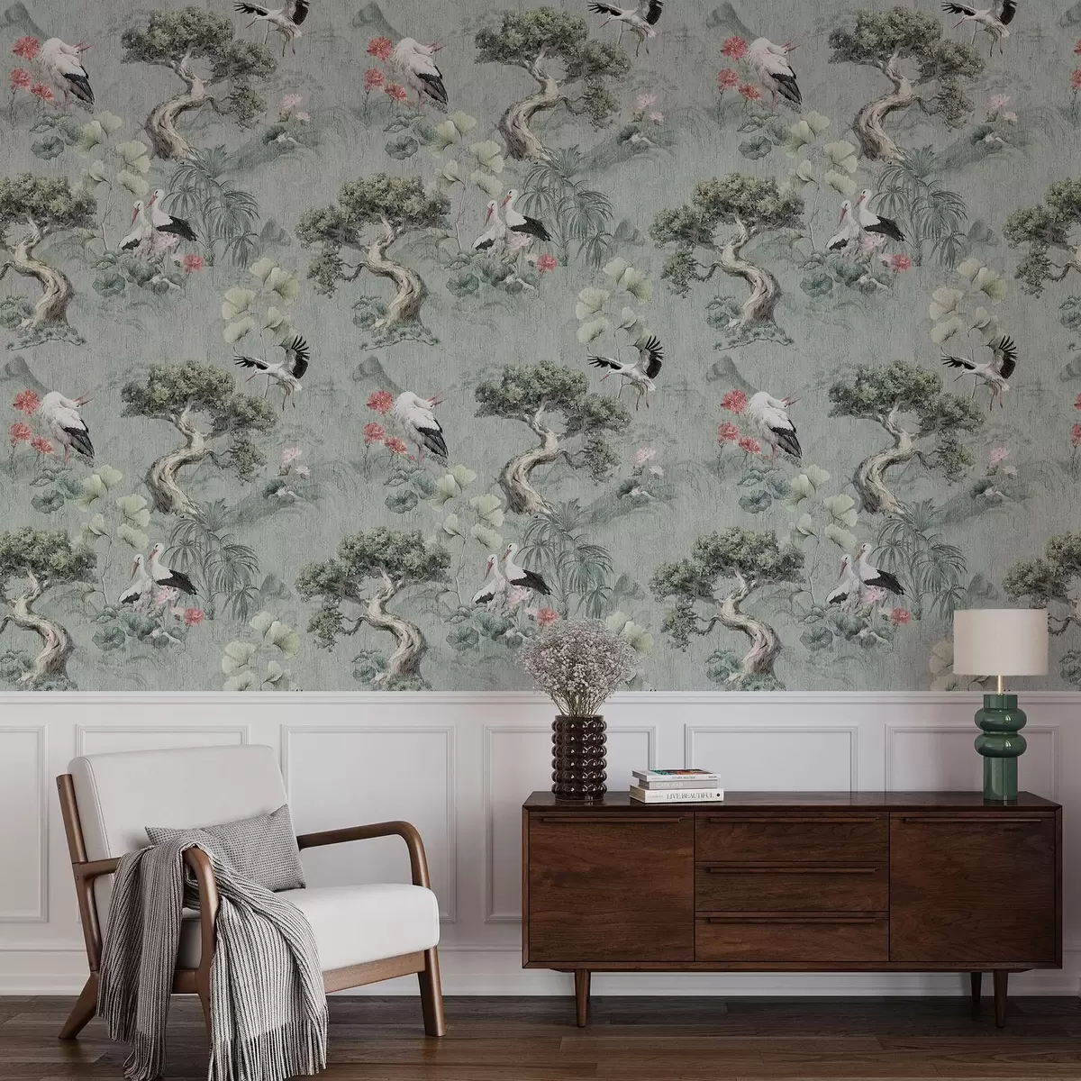 Papel pintado Grullas entre pinos y lotos sobre un tranquilo fondo verde. Nr. a00962