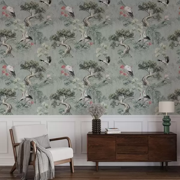 Papel pintado Grullas entre pinos y lotos sobre un tranquilo fondo verde Nr. a00962