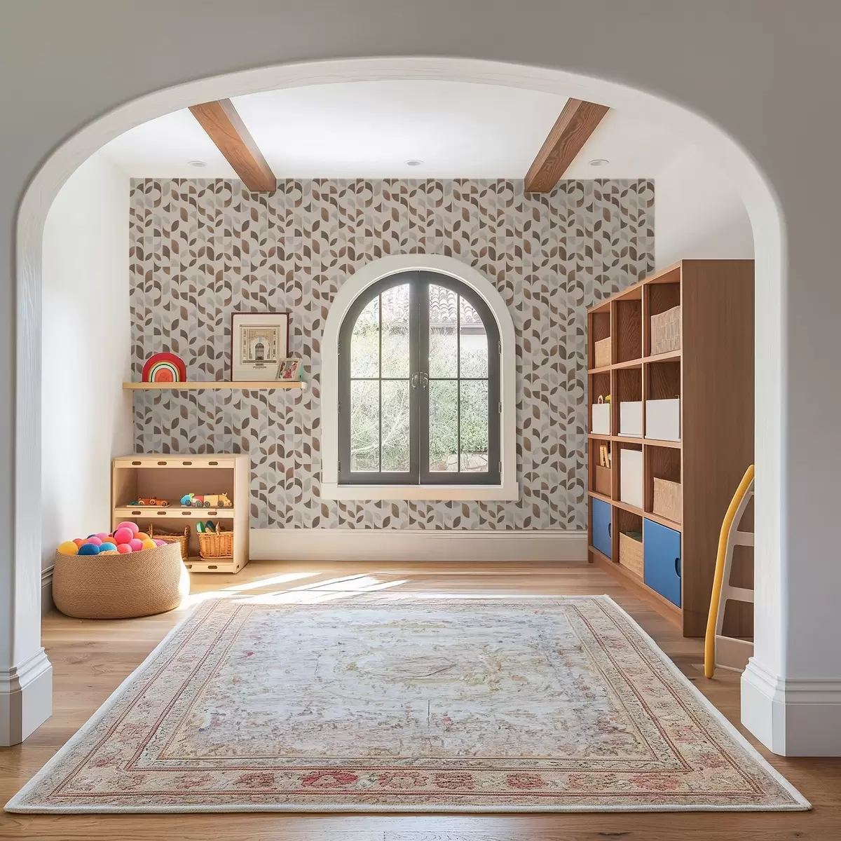Papel pintado Ritmo de semicírculos y hojas en cálidos tonos marrón caramelo. Nr. a00986v1