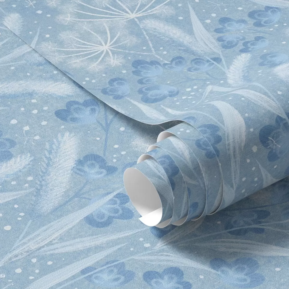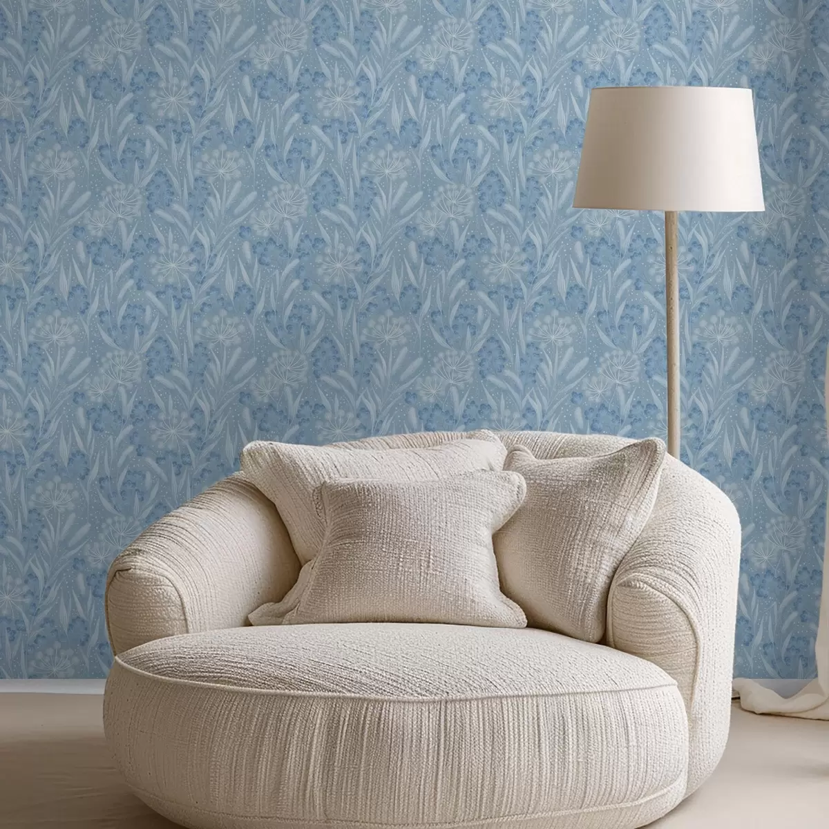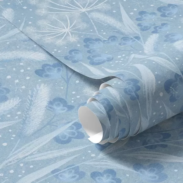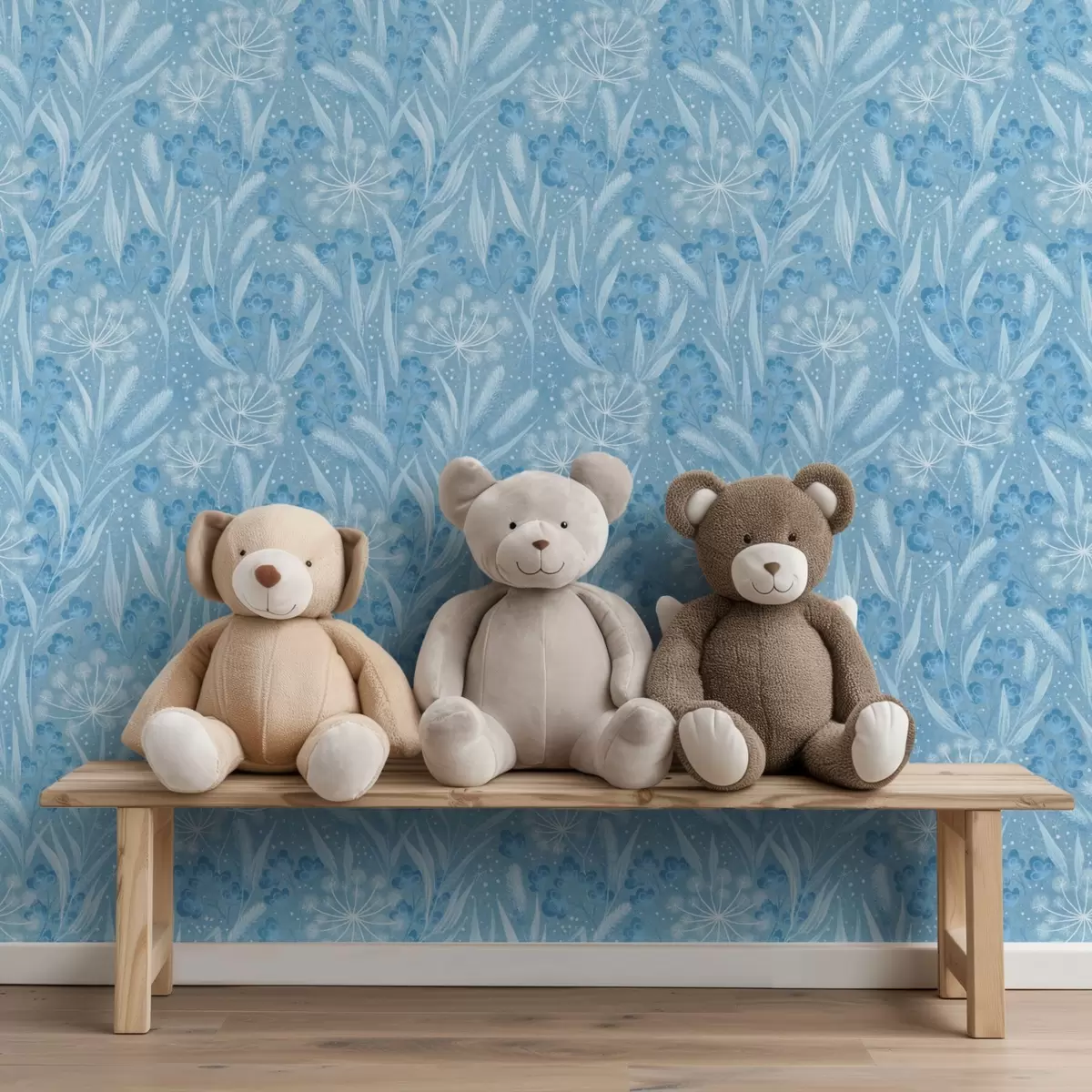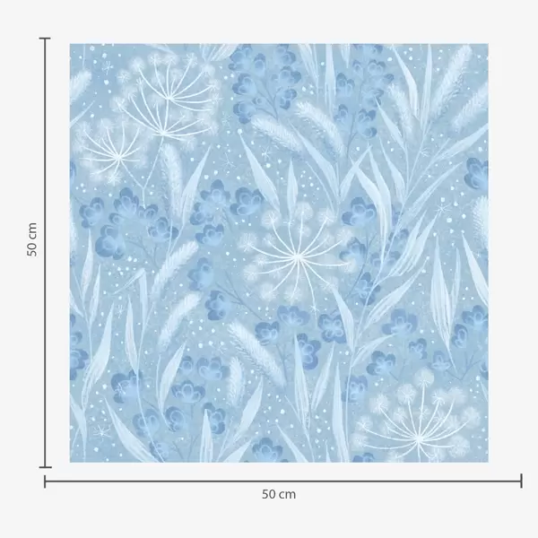 Papel pintado Pradera azul helada con semillas de diente de león y pequeñas flores. Nr. a00995