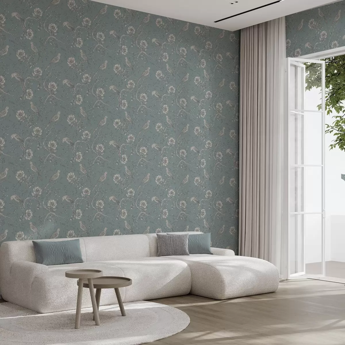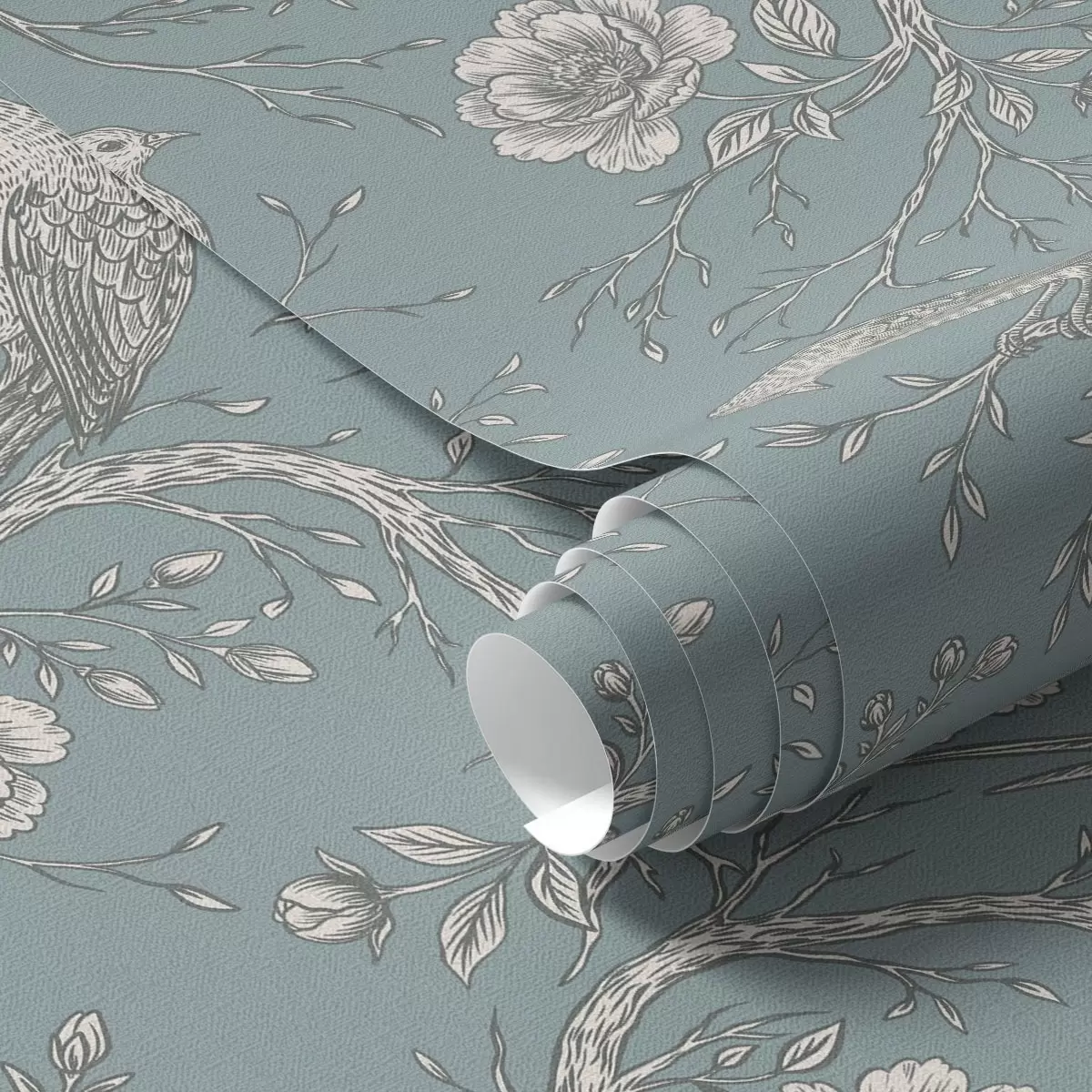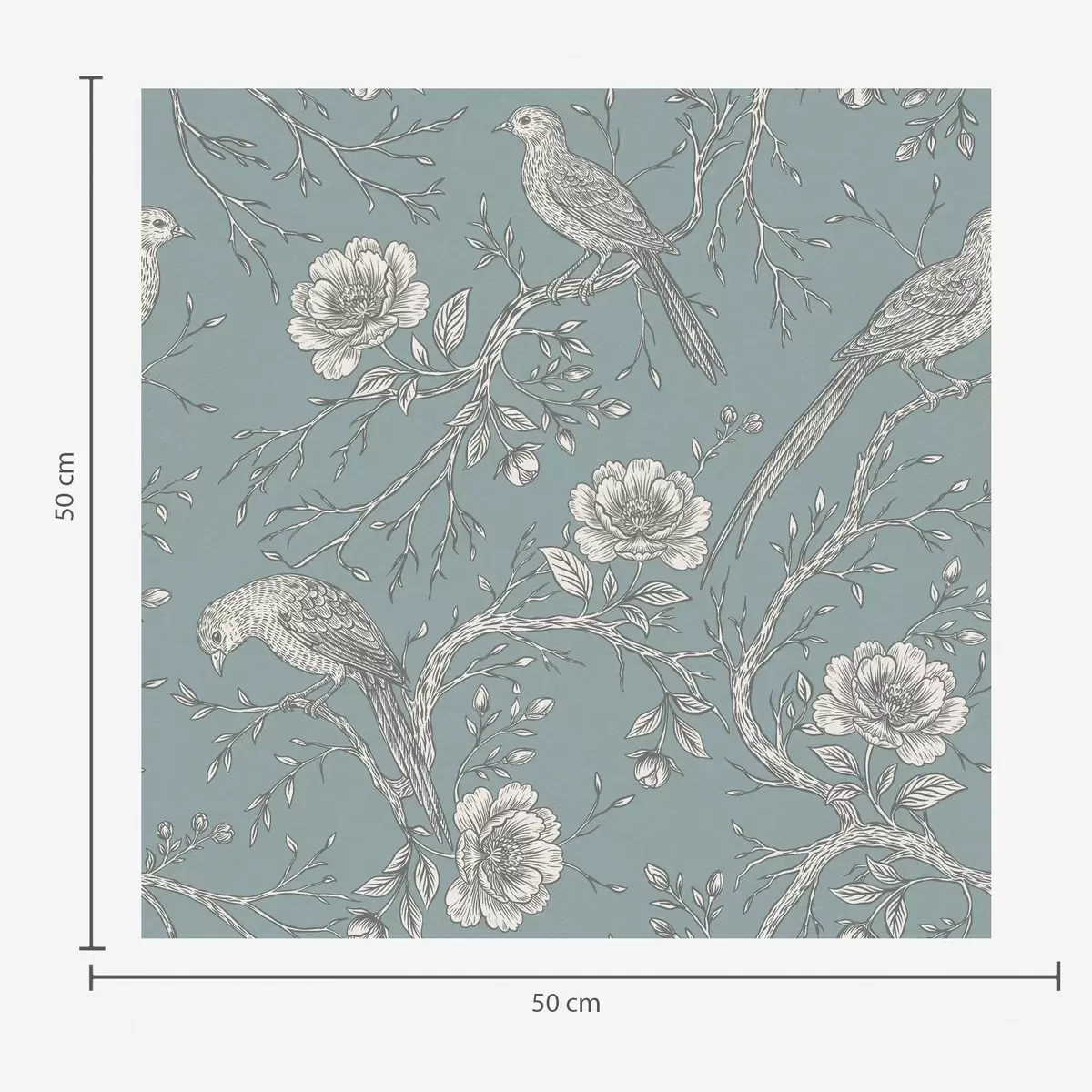Papel pintado Pájaros dibujados en contorno sobre ramas, fondo azul apagado. Nr. a01022