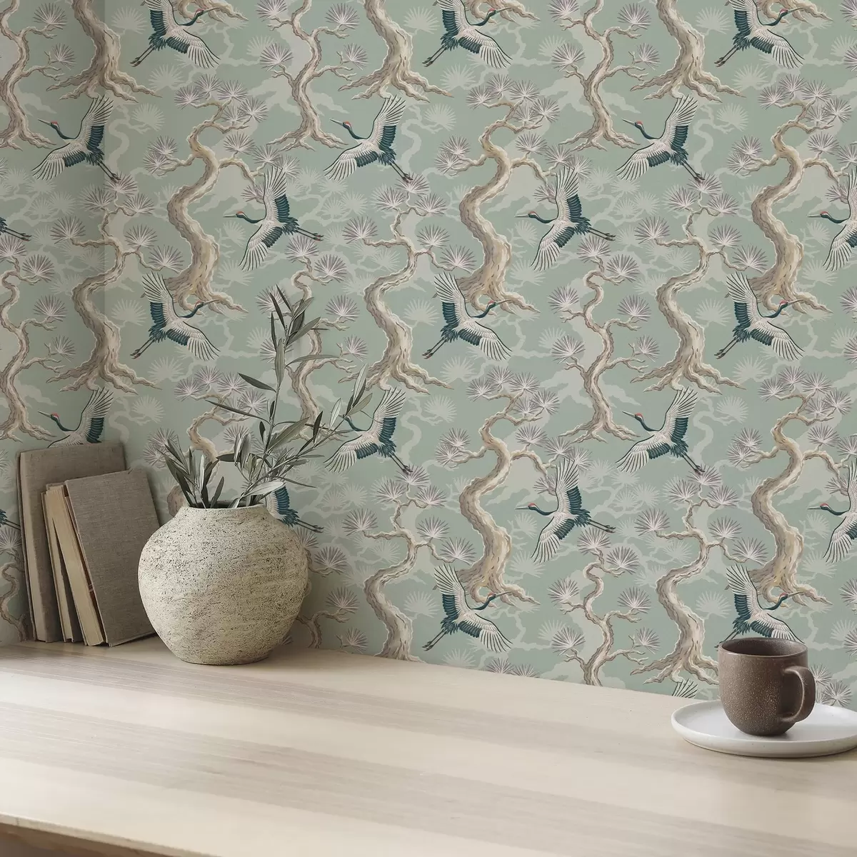Papel pintado Grullas entre ramas curvadas sobre un suave fondo color salvia. Nr. a01023