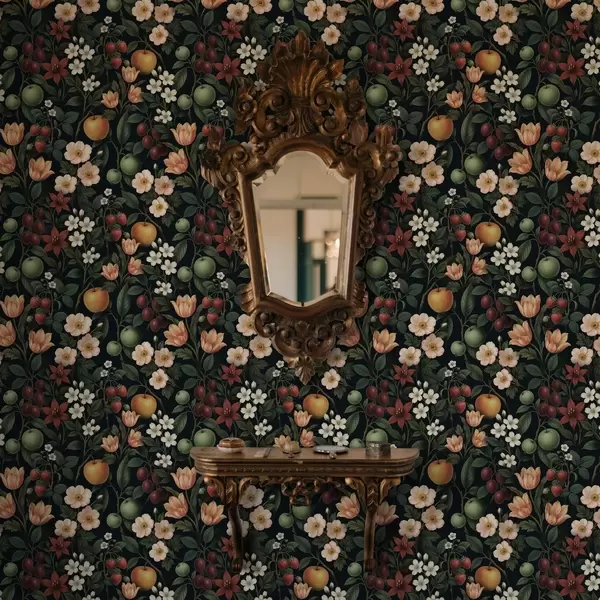 Papel pintado Jardín oscuro con flores, manzanas maduras y bayas. Nr. a01034