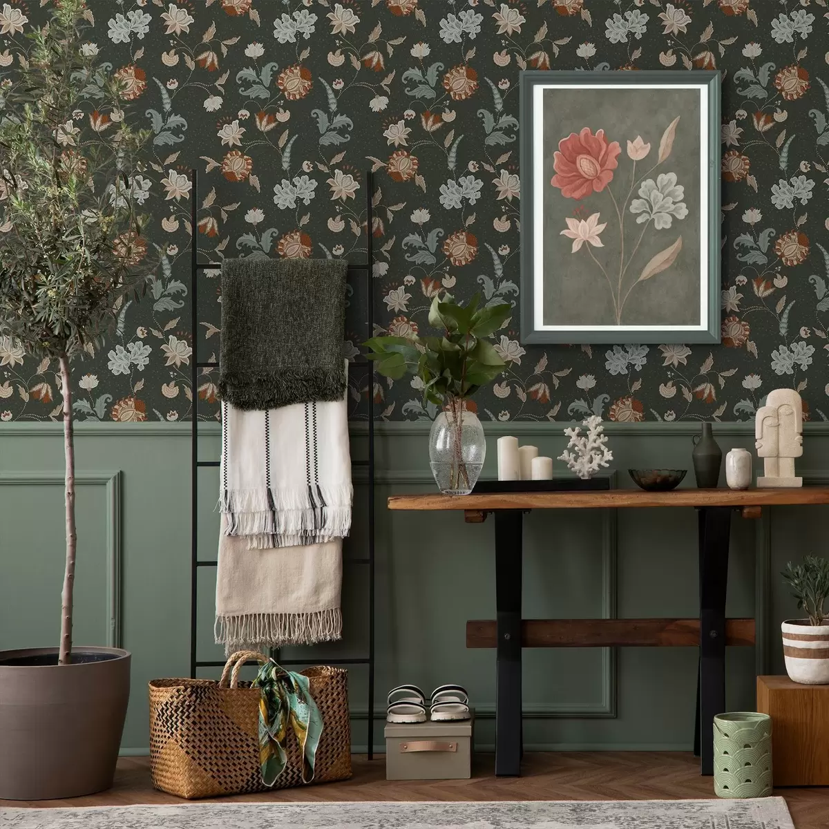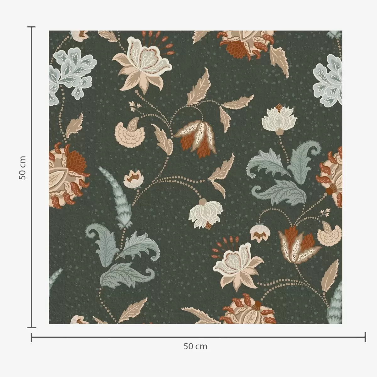 Papel pintado Fondo verde oscuro con flores y hojas decorativas. Nr. a01086
