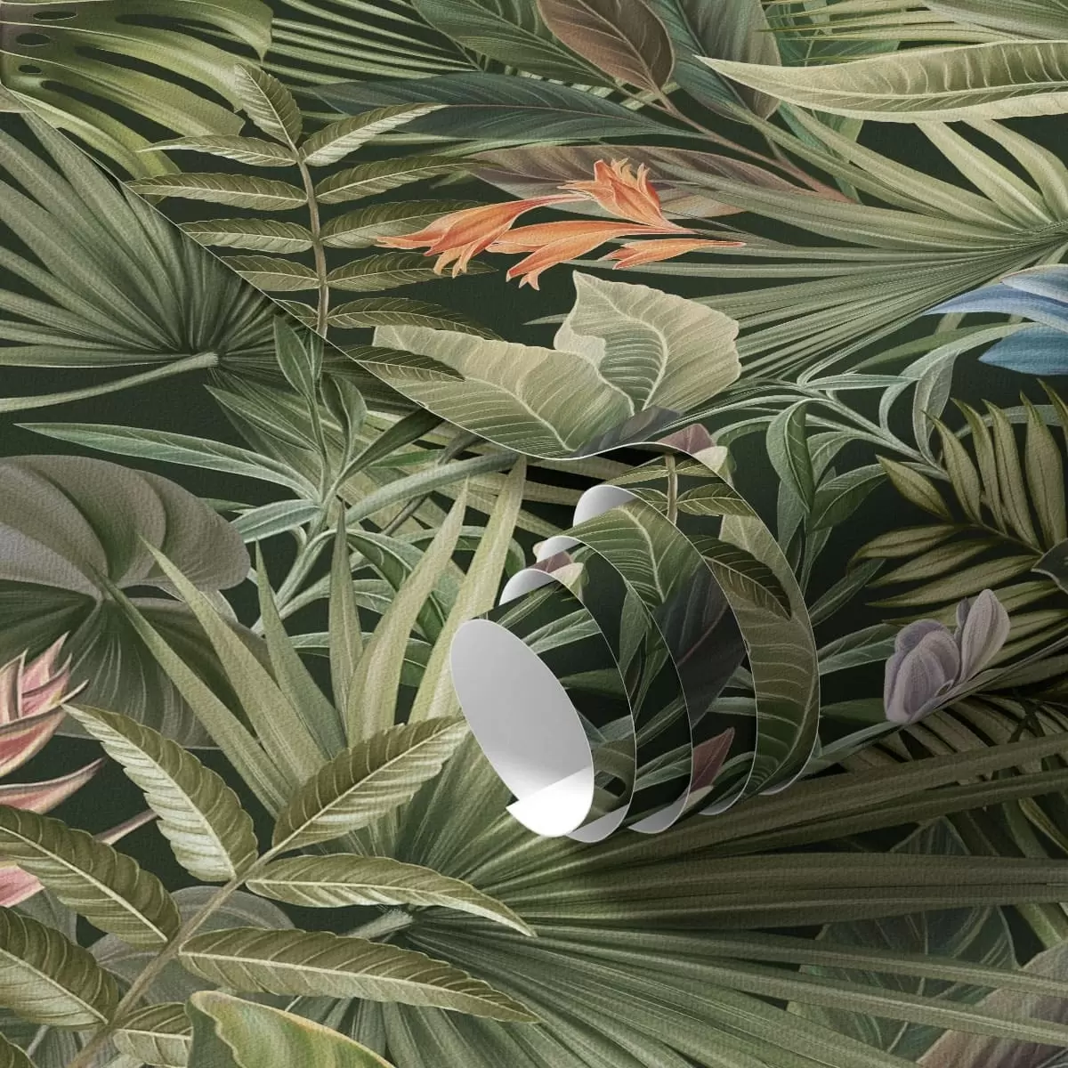 Papel pintado Hojas tropicales con flores sobre fondo oscuro Nr. a01153