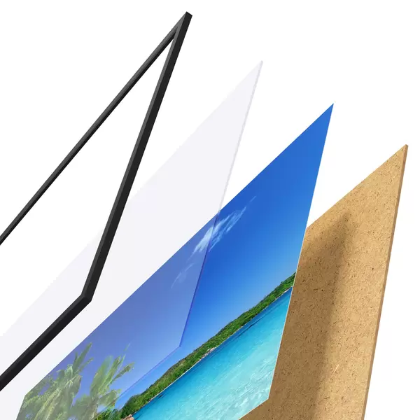 El póster consta de marco, plexiglás, imagen impresa y soporte de aglomerado. El póster puede colgarse inmediatamente en la pared gracias a los soportes de la parte posterior.