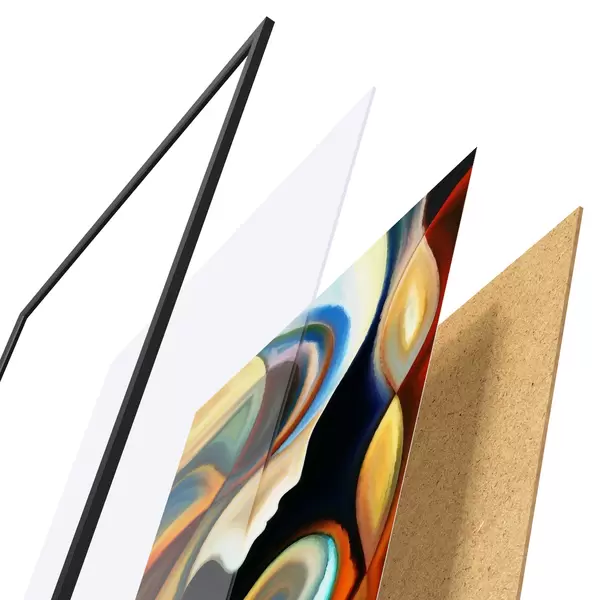 El póster consta de marco, plexiglás, imagen impresa y soporte de aglomerado. El póster puede colgarse inmediatamente en la pared gracias a los soportes de la parte posterior.