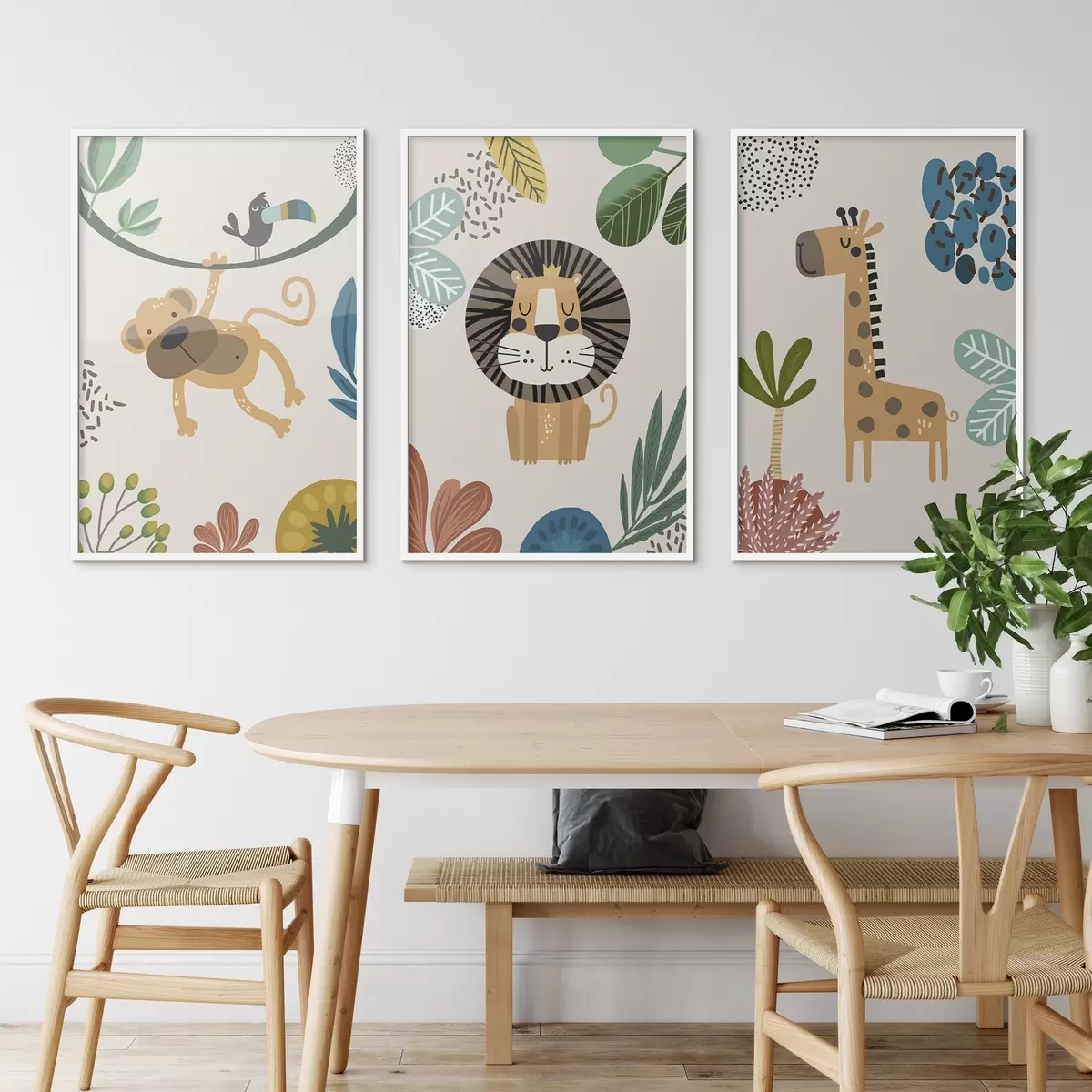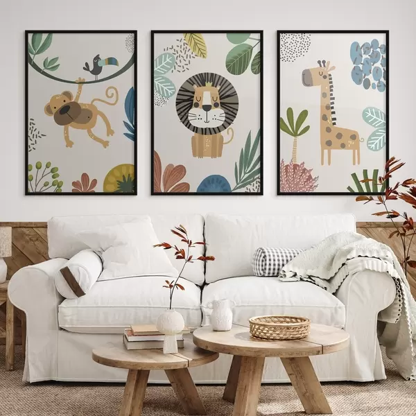 Poster Animales en la selva al estilo safari, boho: mono, león, jirafa Nr d00332