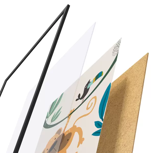 El póster consta de marco, plexiglás, imagen impresa y soporte de aglomerado. El póster puede colgarse inmediatamente en la pared gracias a los soportes de la parte posterior.