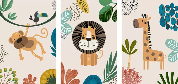Poster Animales en la selva al estilo safari, boho: mono, león, jirafa Nr d00332