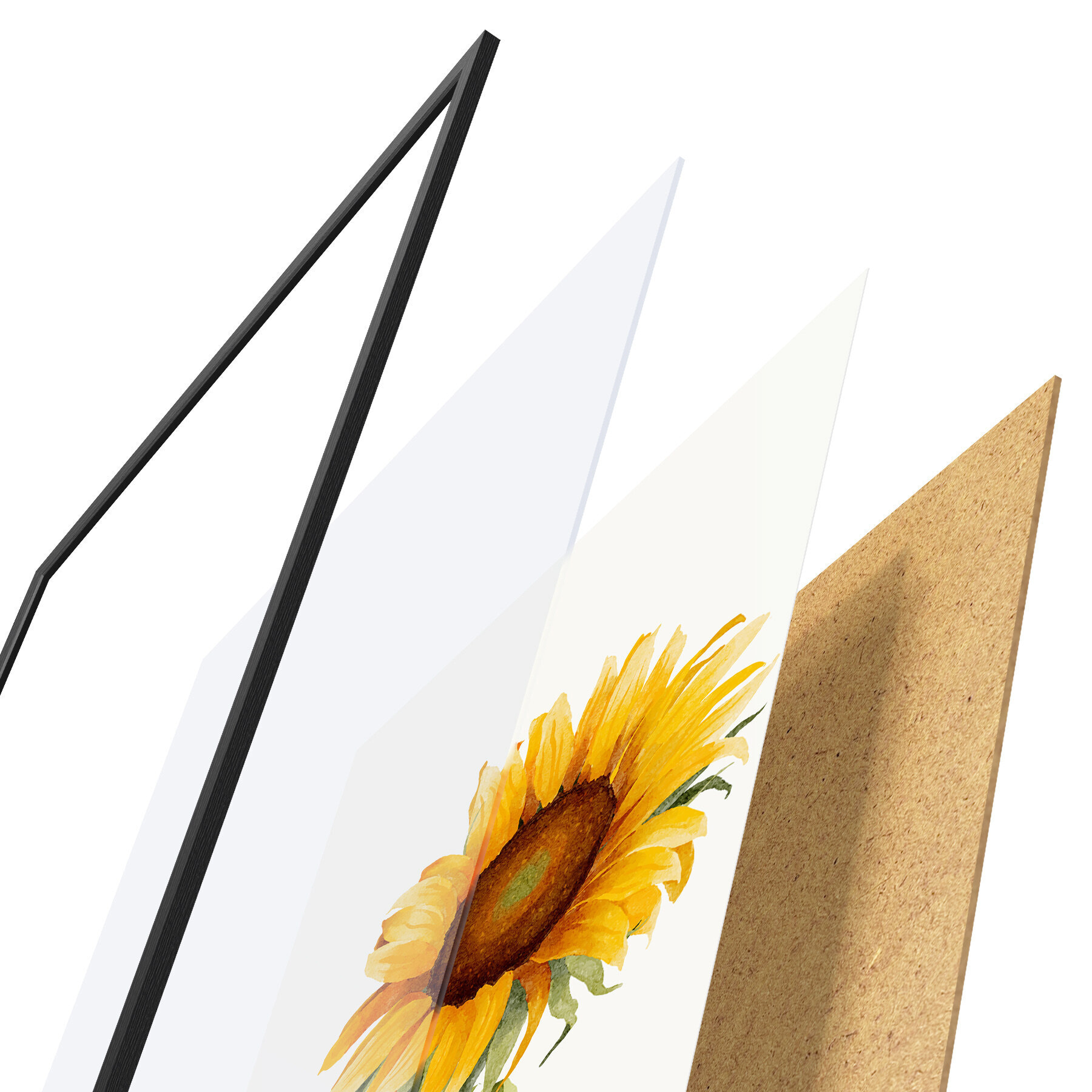 El póster consta de marco, plexiglás, imagen impresa y soporte de aglomerado. El póster puede colgarse inmediatamente en la pared gracias a los soportes de la parte posterior.