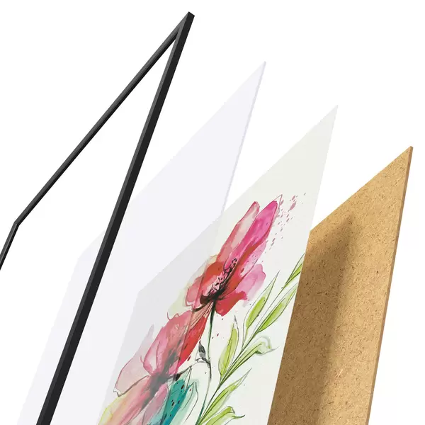 El póster consta de marco, plexiglás, imagen impresa y soporte de aglomerado. El póster puede colgarse inmediatamente en la pared gracias a los soportes de la parte posterior.