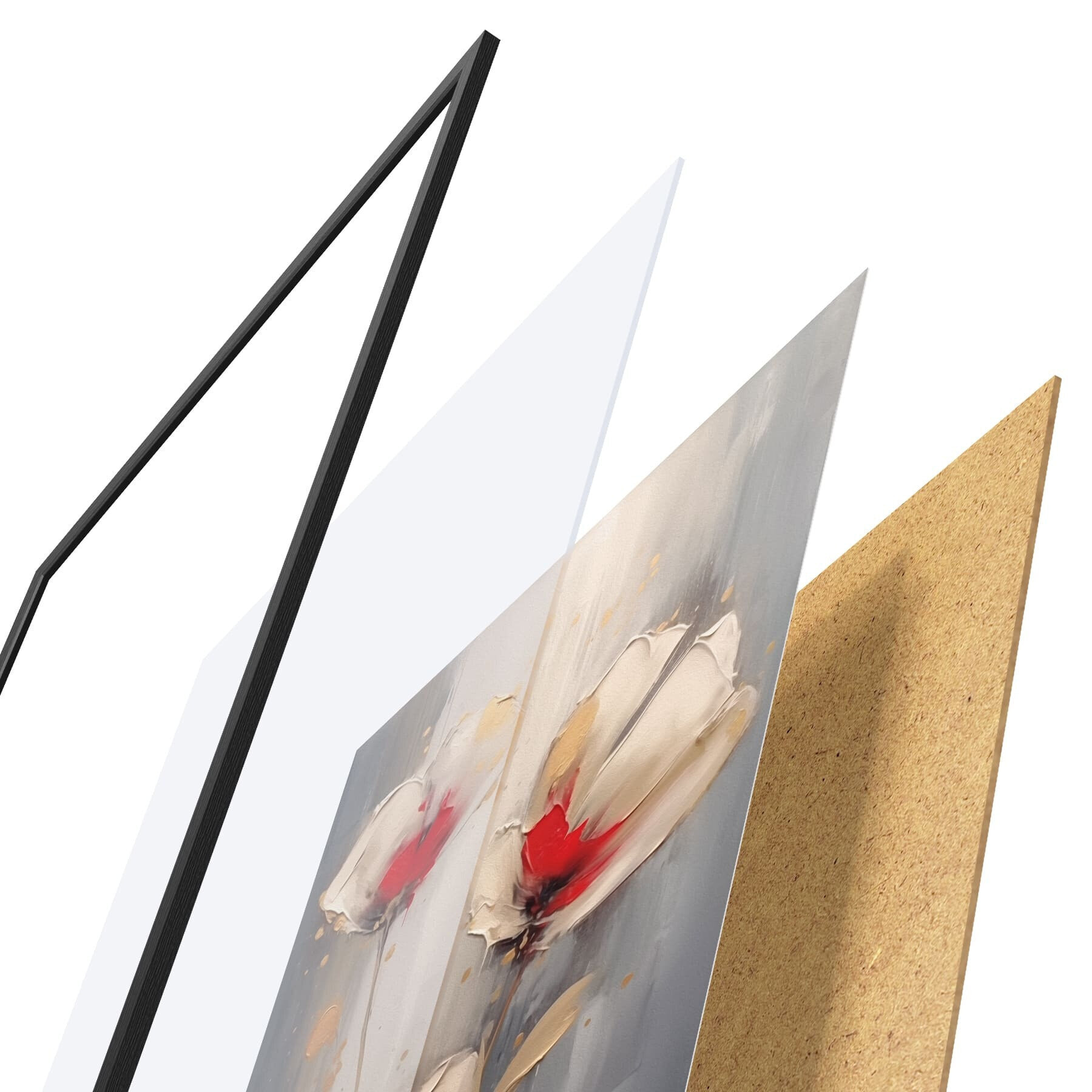 El póster consta de marco, plexiglás, imagen impresa y soporte de aglomerado. El póster puede colgarse inmediatamente en la pared gracias a los soportes de la parte posterior.