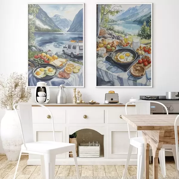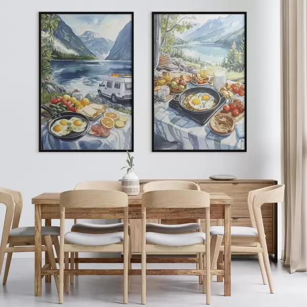Poster Desayuno en la naturaleza, viajar, vida al aire libre, estilo acuarela, Noruega d00404