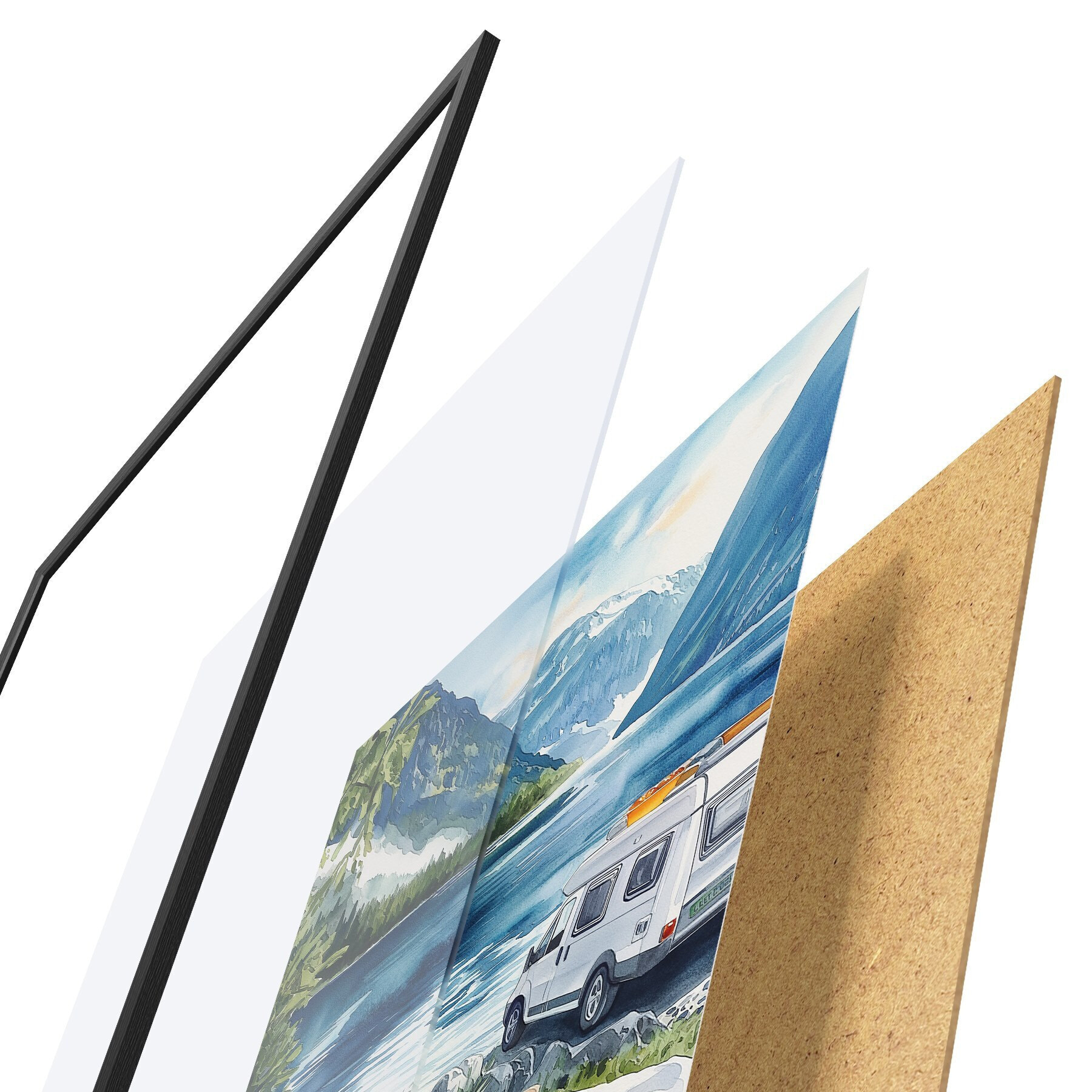 El póster consta de marco, plexiglás, imagen impresa y soporte de aglomerado. El póster puede colgarse inmediatamente en la pared gracias a los soportes de la parte posterior.