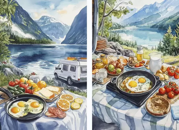 Poster Desayuno en la naturaleza, viajar, vida al aire libre, estilo acuarela, Noruega d00404