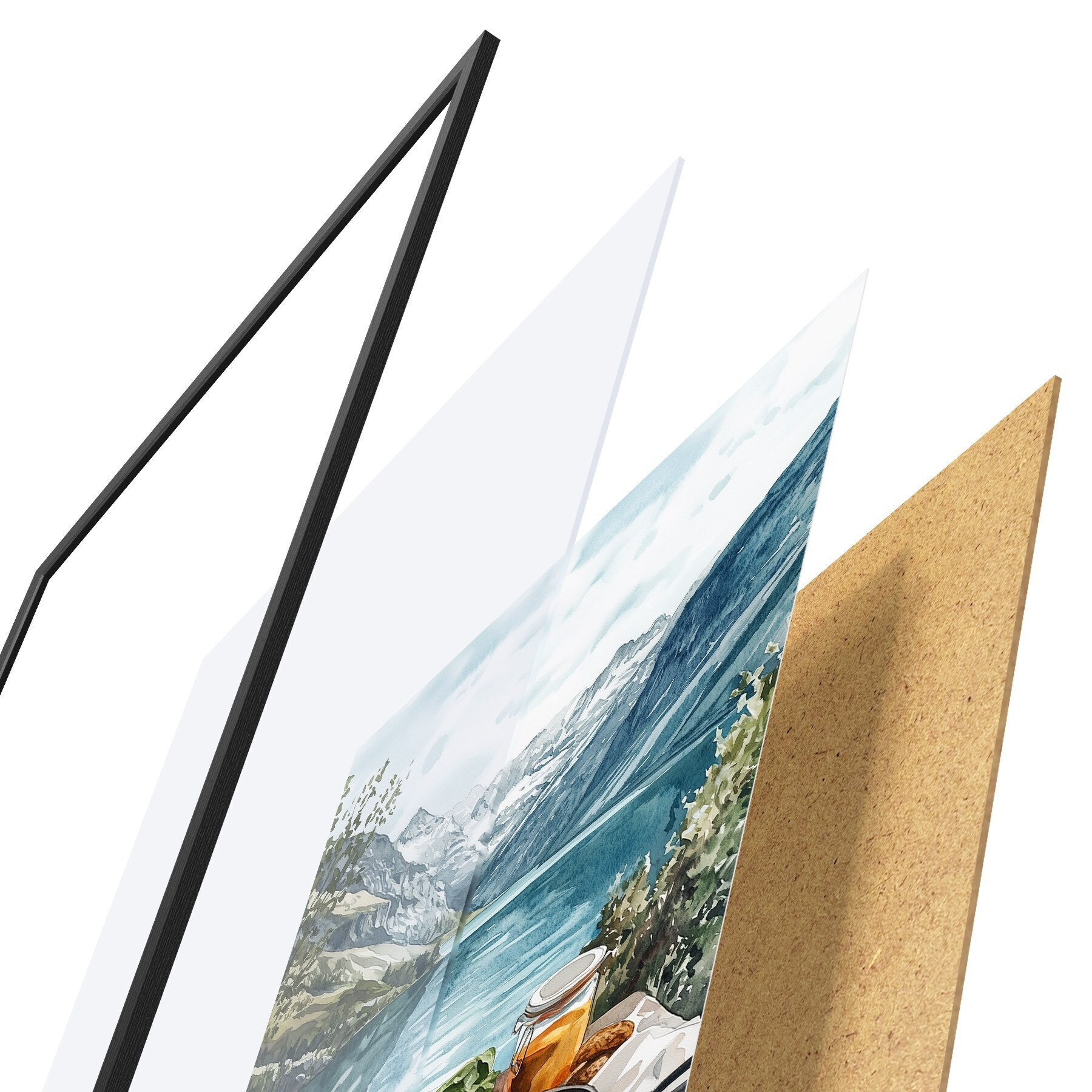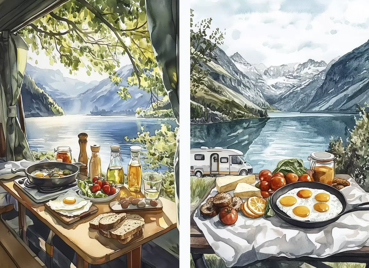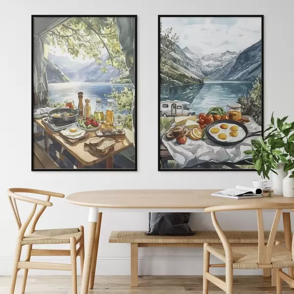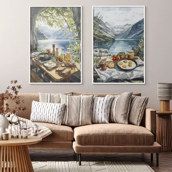 Poster Camping, desayuno estético cerca del lago, estilo acuarela Nr d00405