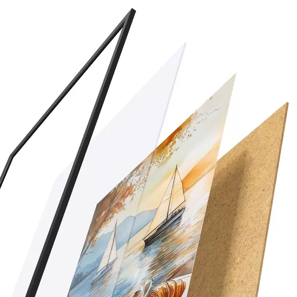 El póster consta de marco, plexiglás, imagen impresa y soporte de aglomerado. El póster puede colgarse inmediatamente en la pared gracias a los soportes de la parte posterior.