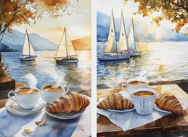 Poster Puesta de sol en el lago con ups de café, veleros, naturaleza, viajes Nr d00407