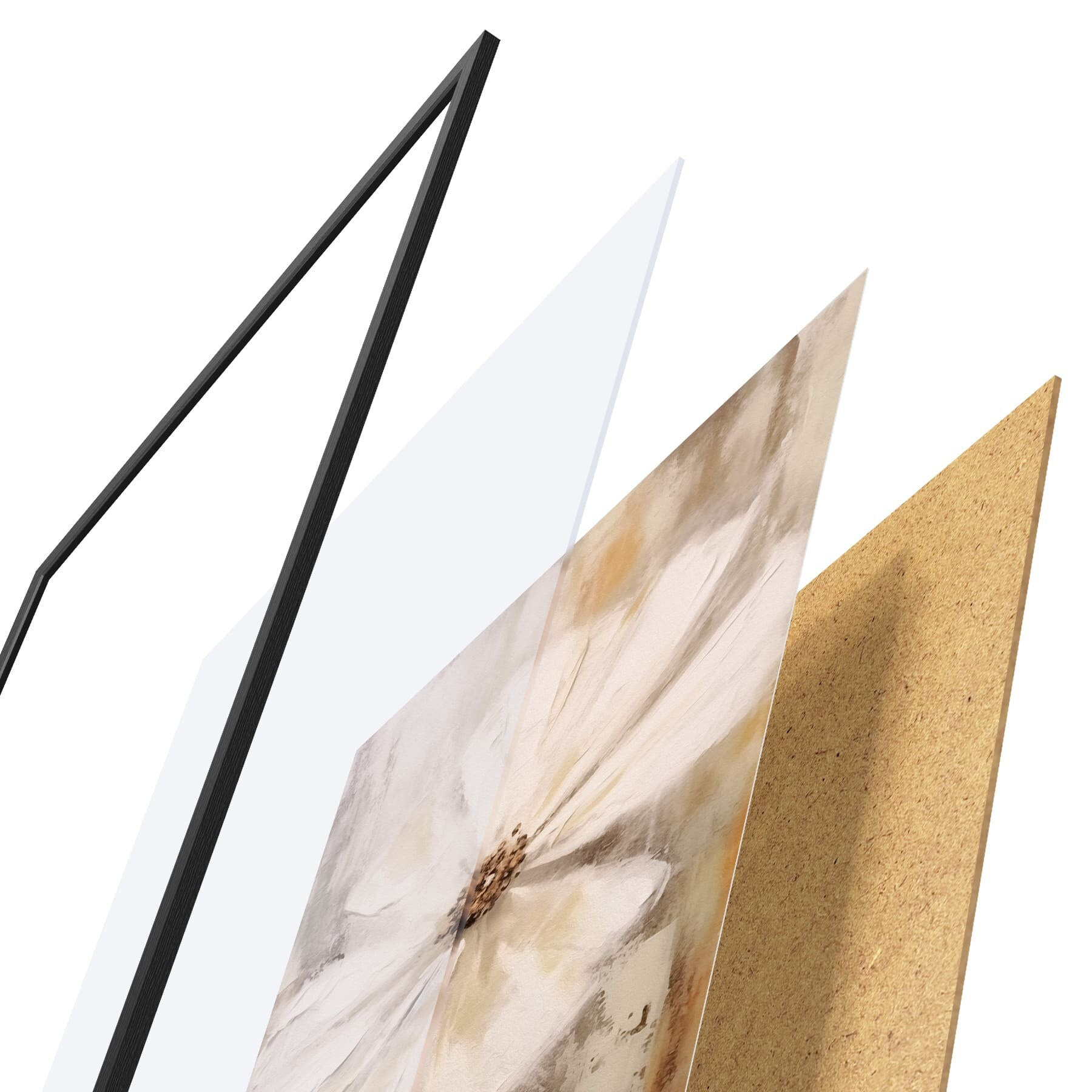 El póster consta de marco, plexiglás, imagen impresa y soporte de aglomerado. El póster puede colgarse inmediatamente en la pared gracias a los soportes de la parte posterior.