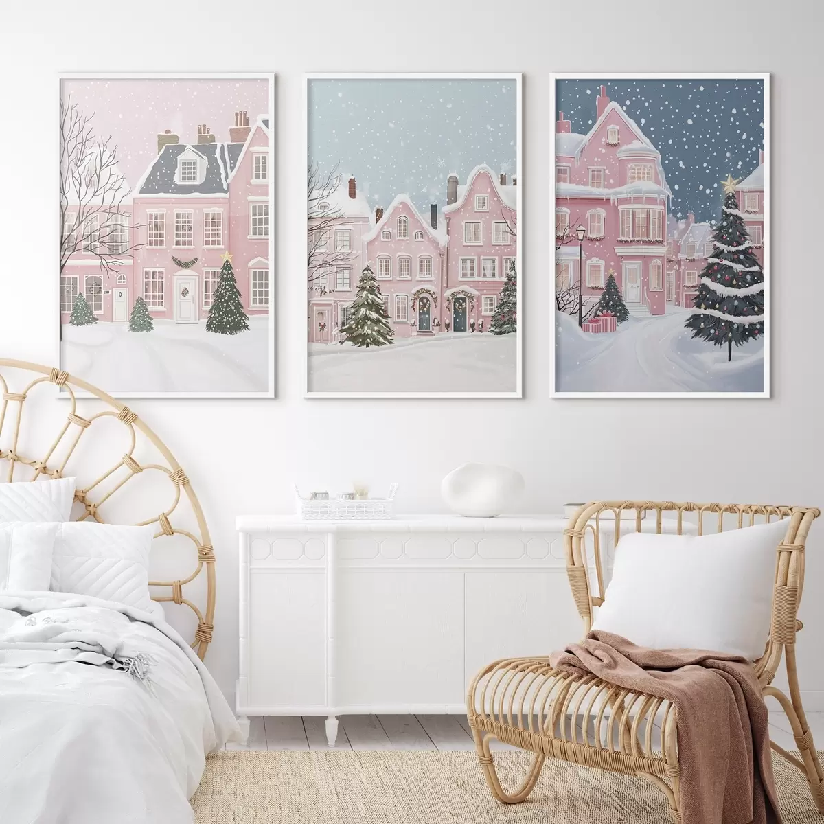 Poster Preciosa ciudad invernal con casas rosas, pinos y copos de nieve d00410