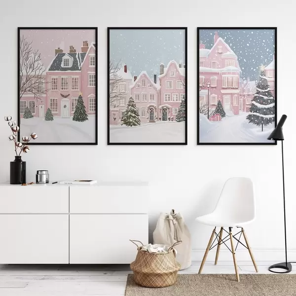 Poster Preciosa ciudad invernal con casas rosas, pinos y copos de nieve Nr d00410