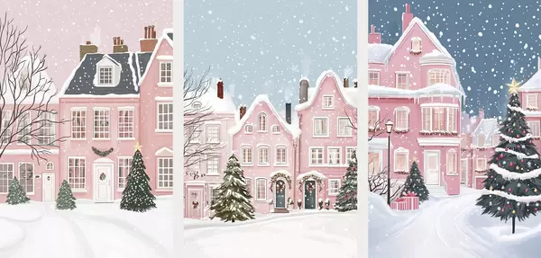Poster Preciosa ciudad invernal con casas rosas, pinos y copos de nieve d00410