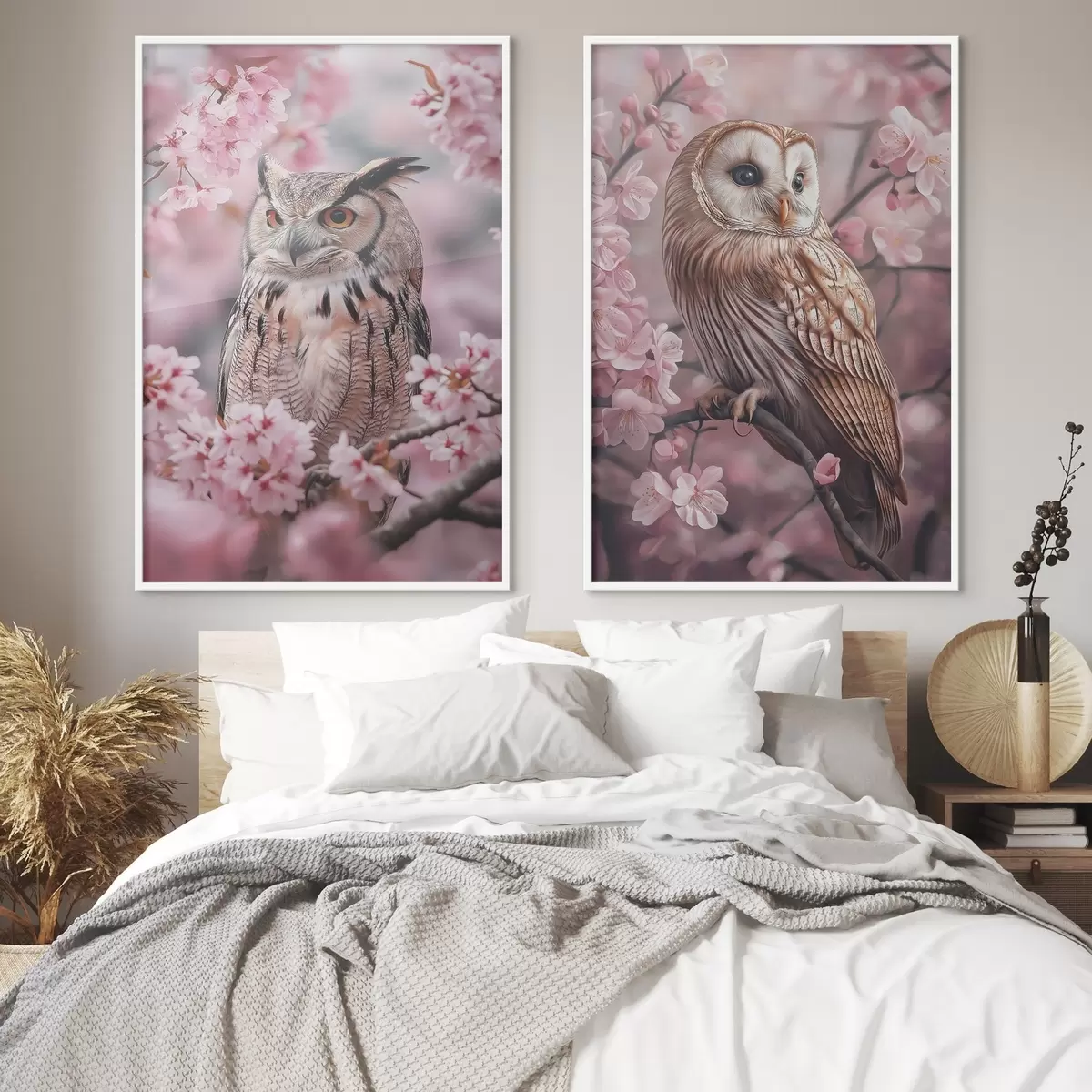 Poster Búhos en el cerezo, flores rosas, realismo, naturaleza Nr d00411