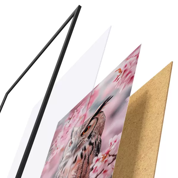 El póster consta de marco, plexiglás, imagen impresa y soporte de aglomerado. El póster puede colgarse inmediatamente en la pared gracias a los soportes de la parte posterior.
