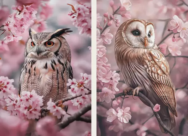 Poster Búhos en el cerezo, flores rosas, realismo, naturaleza Nr d00411
