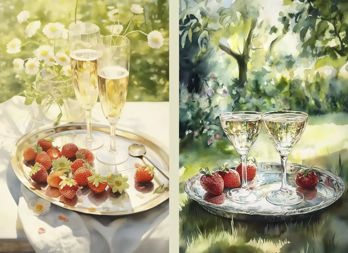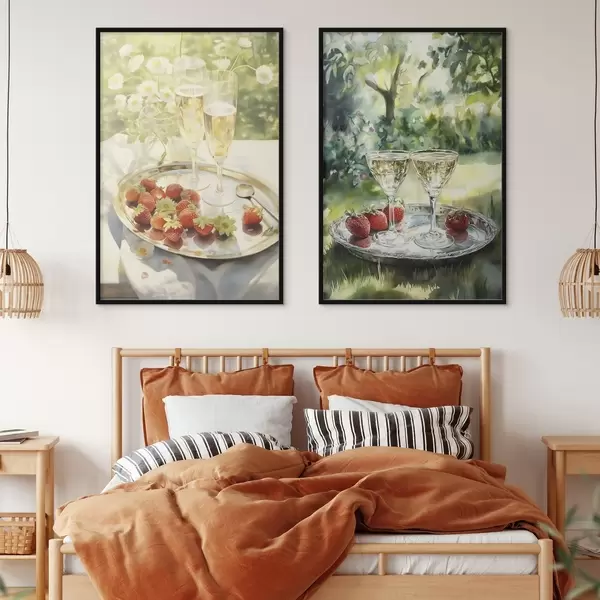 Poster Picnic de verano, copas de champán con fresas en la bandeja, flores de manzanilla Nr d00414