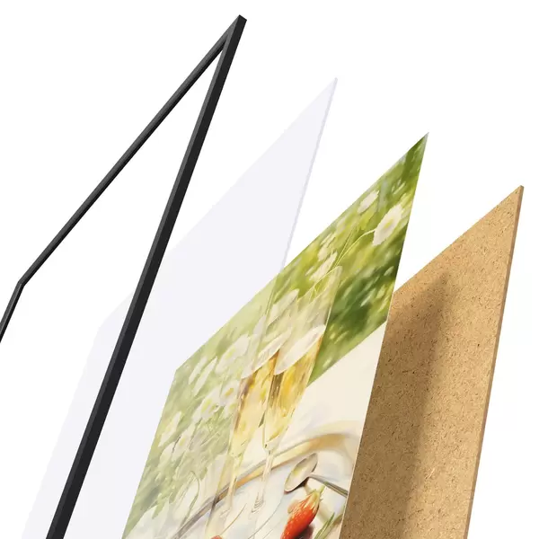 El póster consta de marco, plexiglás, imagen impresa y soporte de aglomerado. El póster puede colgarse inmediatamente en la pared gracias a los soportes de la parte posterior.