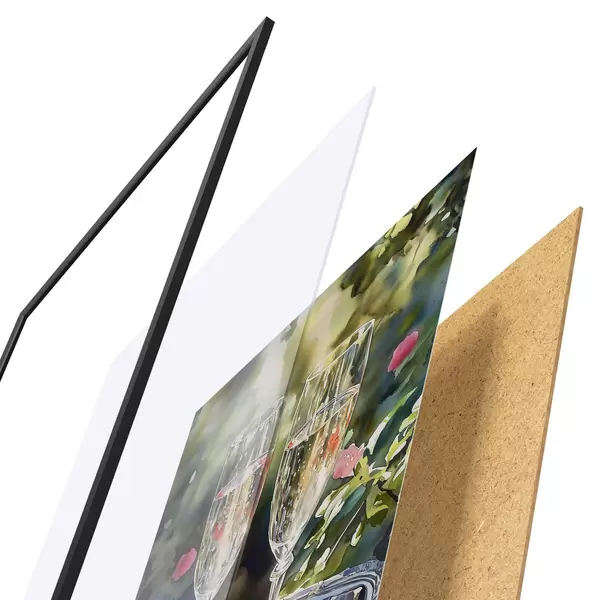 El póster consta de marco, plexiglás, imagen impresa y soporte de aglomerado. El póster puede colgarse inmediatamente en la pared gracias a los soportes de la parte posterior.