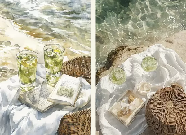 Poster Cócteles en la playa, dibujo estilo acuarela, océano, picnic de verano Nr d00417