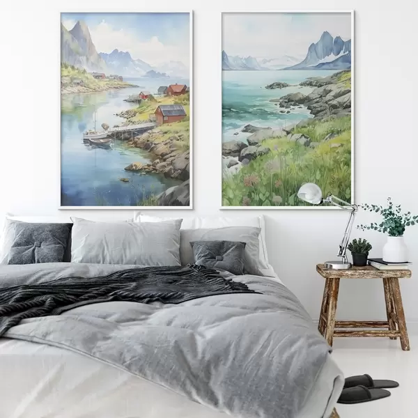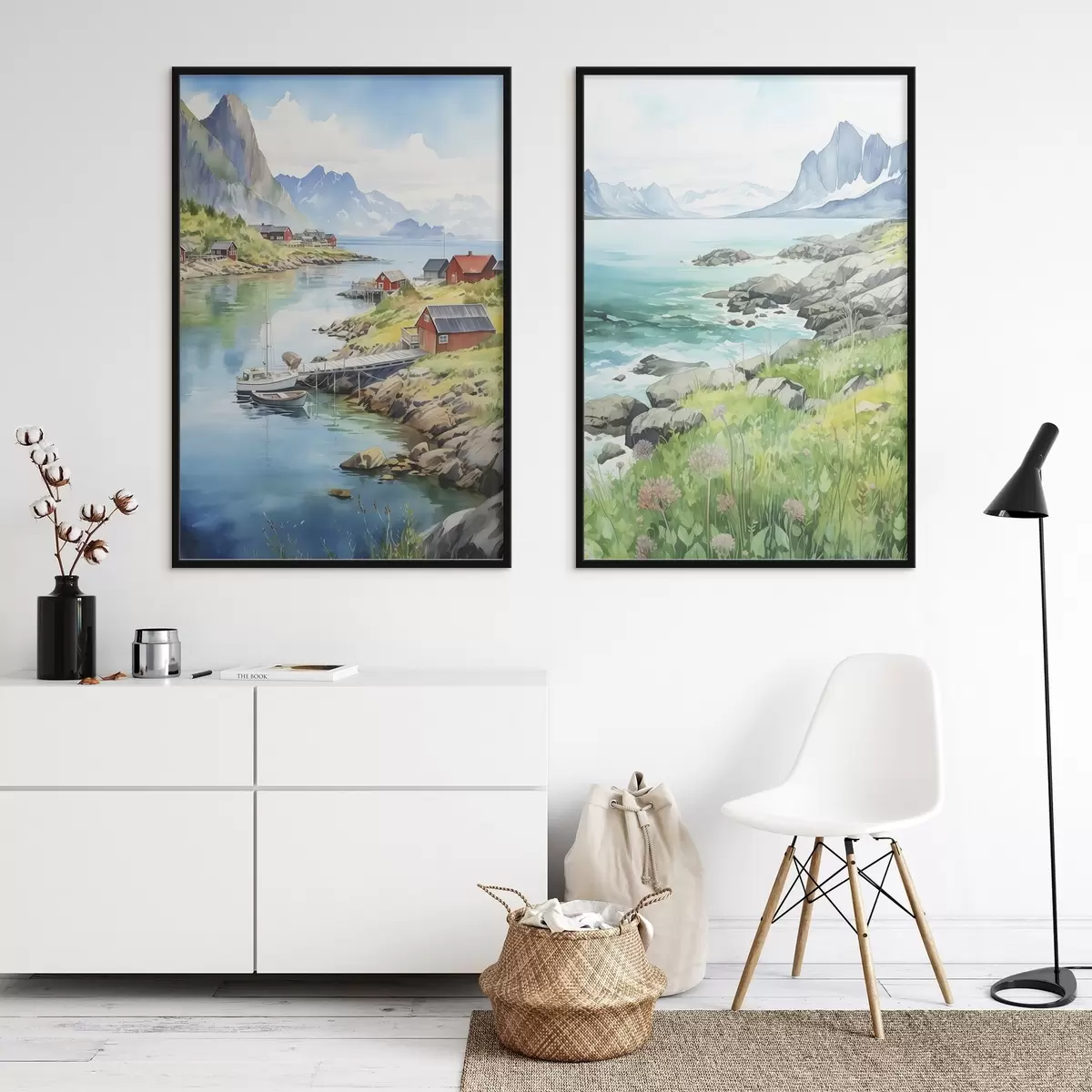 Poster Noruega naturaleza, islas Lofoten, paisaje de verano, casas rojas, montañas, barcos Nr d00421