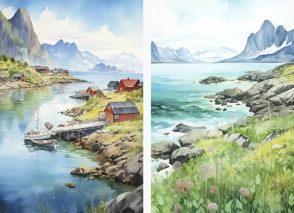 Poster Noruega naturaleza, islas Lofoten, paisaje de verano, casas rojas, montañas, barcos Nr d00421