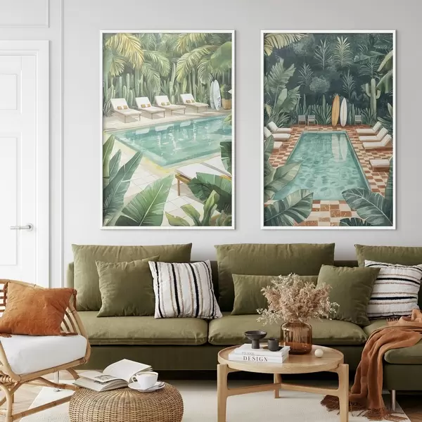 Poster Piscina de verano, vintage, bosque tropical, vegetación, palmeras, estilo acuarela d00422