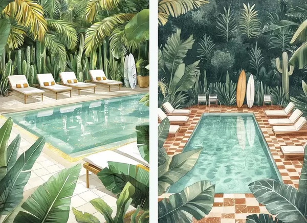 Poster Piscina de verano, vintage, bosque tropical, vegetación, palmeras, estilo acuarela d00422