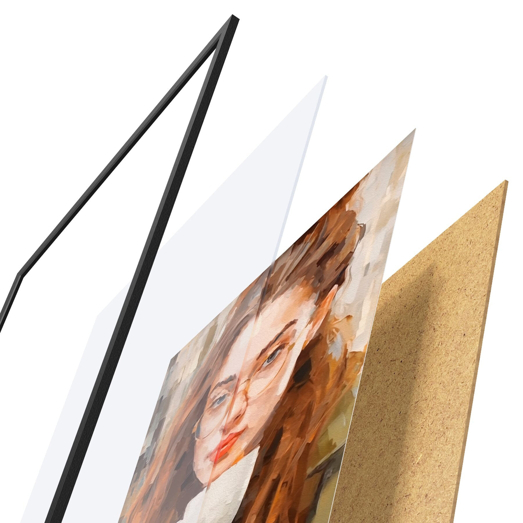 El póster consta de marco, plexiglás, imagen impresa y soporte de aglomerado. El póster puede colgarse inmediatamente en la pared gracias a los soportes de la parte posterior.