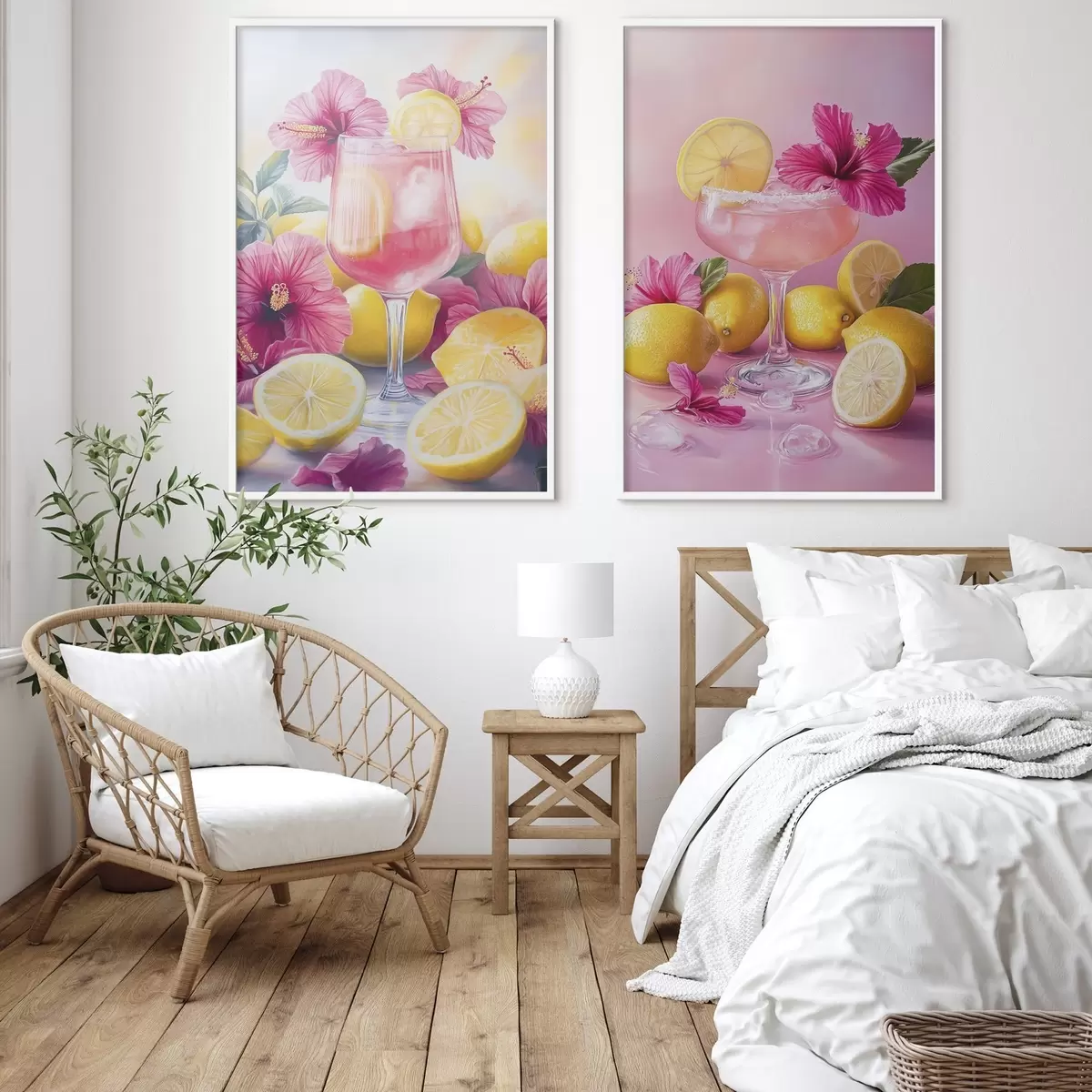 Poster Cócteles con flores de hibisco y limones, veraniegos, jugosos, estilo acuarela d00446