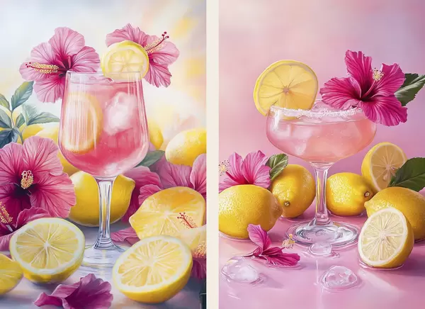 Poster Cócteles con flores de hibisco y limones, veraniegos, jugosos, estilo acuarela d00446