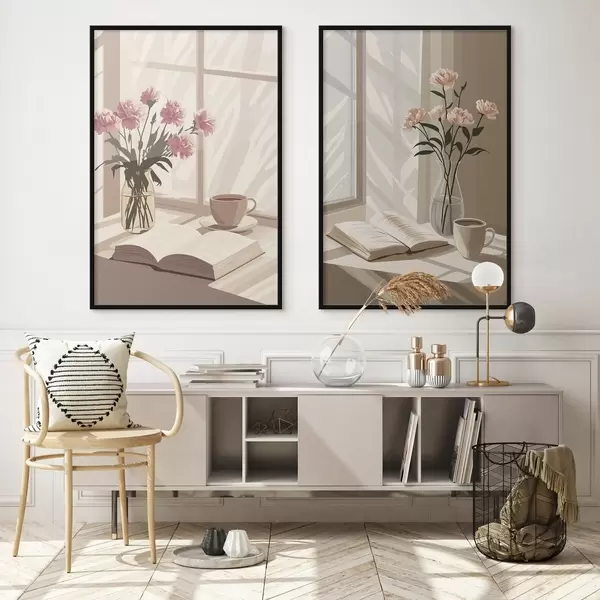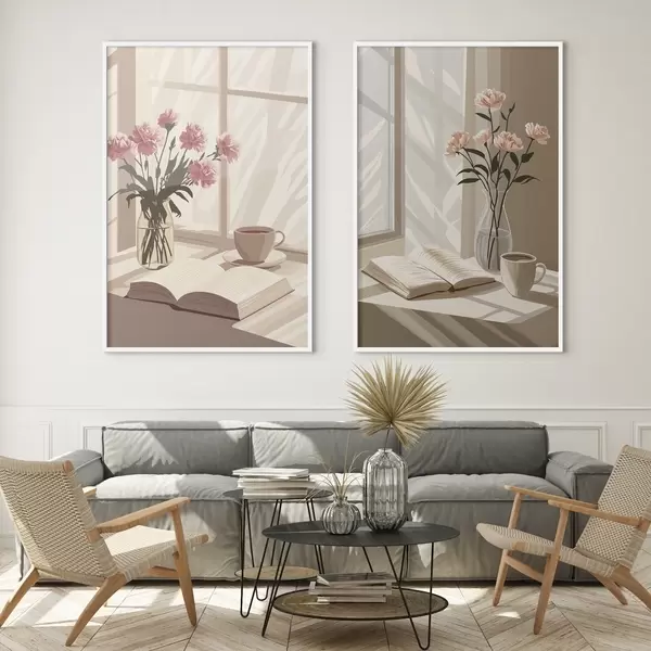 Poster Abstracción, estética matinal, taza de café, libro, flores Nr d00448