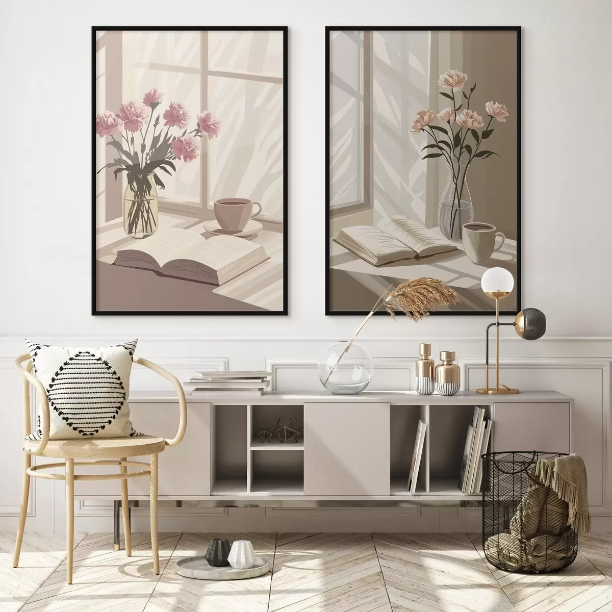 Poster Abstracción, estética matinal, taza de café, libro, flores d00448