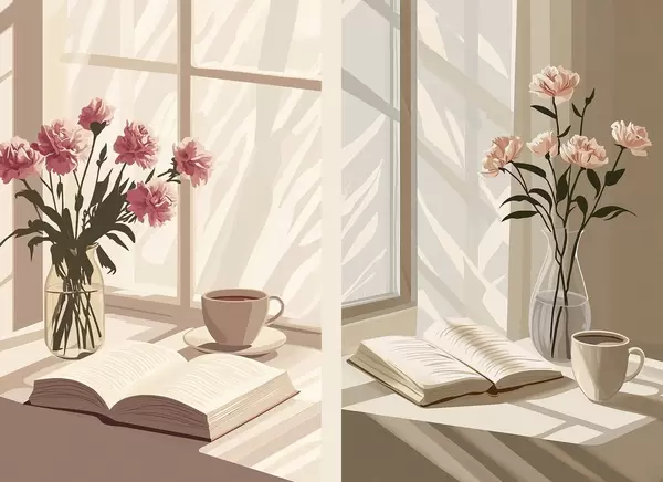 Poster Abstracción, estética matinal, taza de café, libro, flores d00448