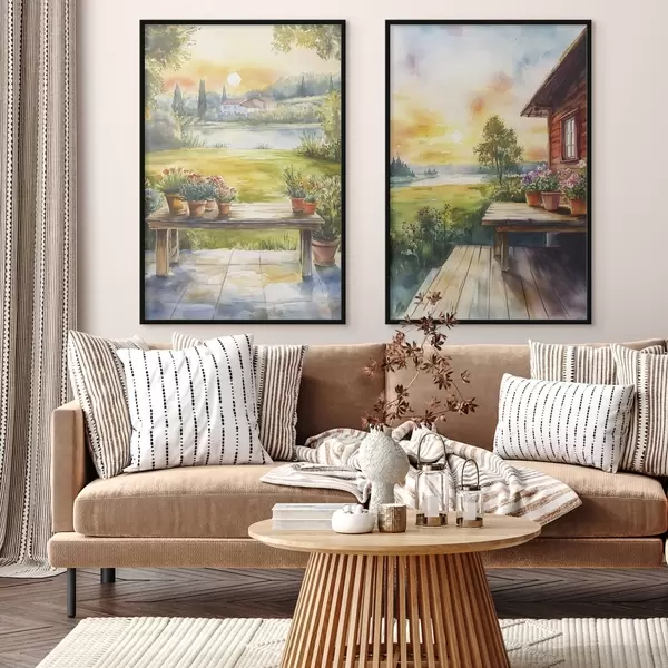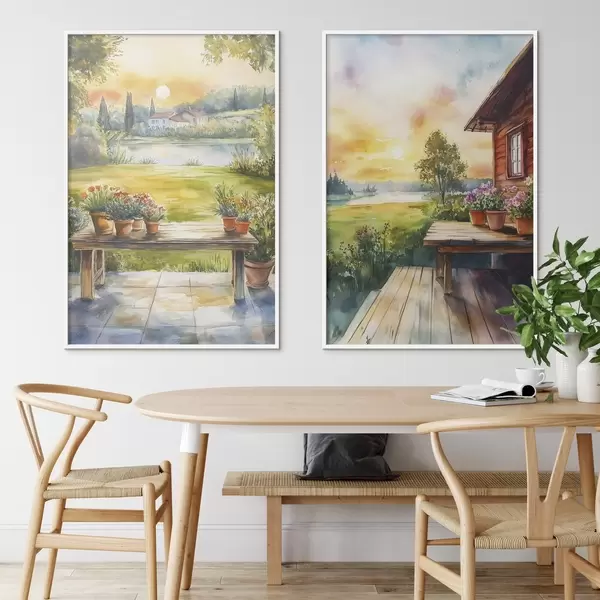 Poster Pueblo de verano, puesta de sol, rústico, flores, lago, estilo acuarela Nr d00449