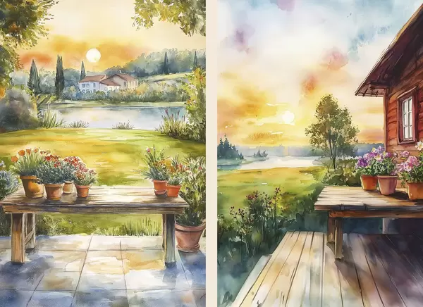 Poster Pueblo de verano, puesta de sol, rústico, flores, lago, estilo acuarela Nr d00449