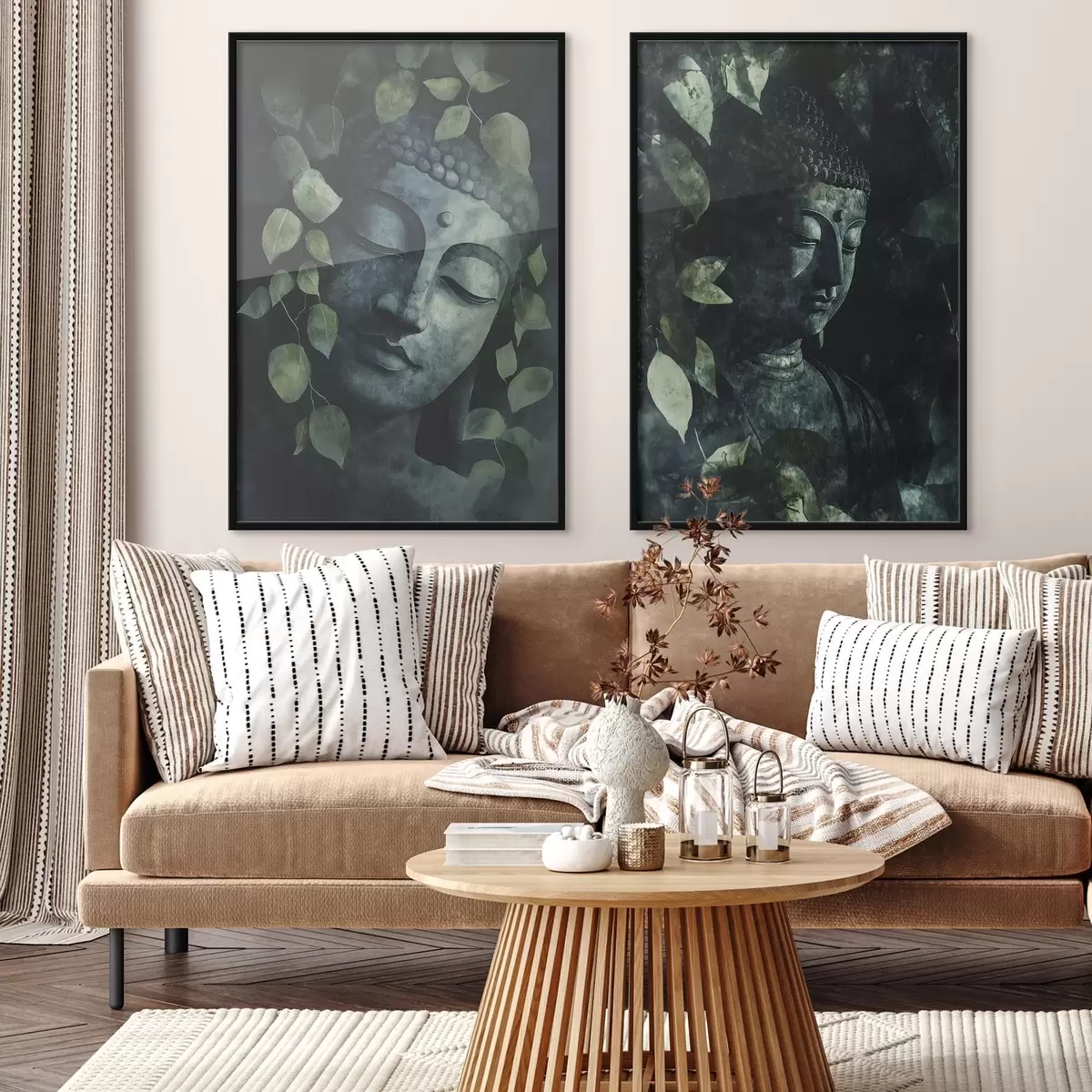 Poster Buda verde en hojas tropicales, estilo acuarela d00451