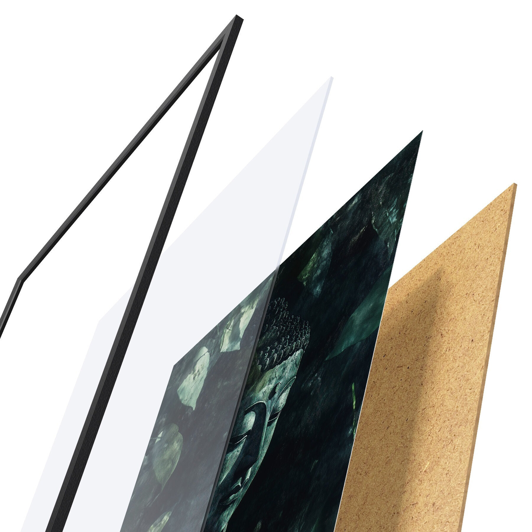 El póster consta de marco, plexiglás, imagen impresa y soporte de aglomerado. El póster puede colgarse inmediatamente en la pared gracias a los soportes de la parte posterior.
